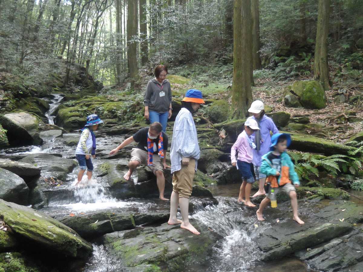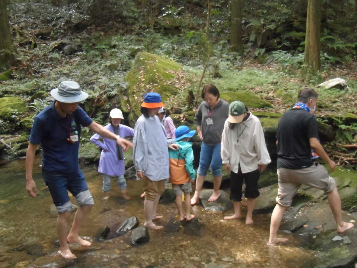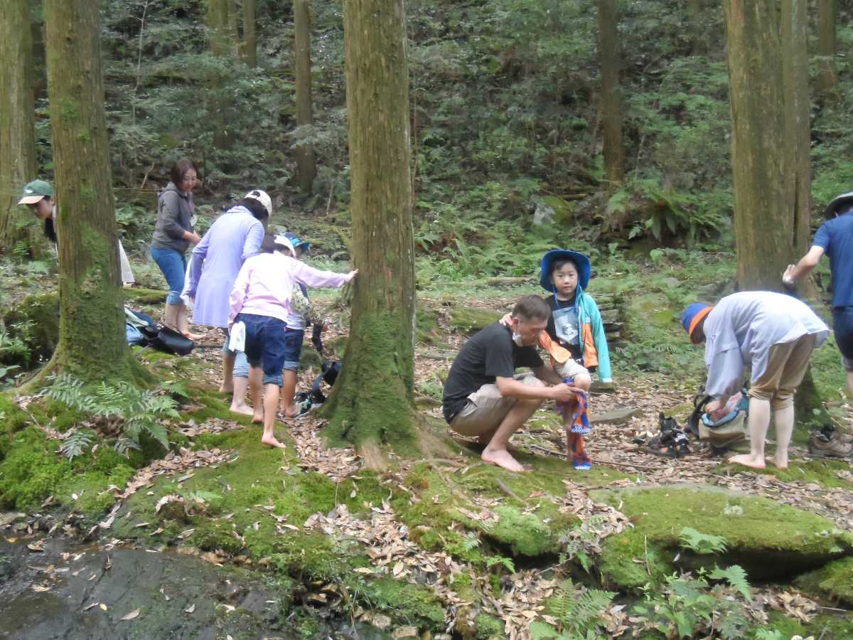 今回はネイチャーゲーム部会の先生たちと一緒に森に入り、自然の中で涼しさを感じるイベントでした。 エアコンや扇風機など便利な家電製品がない森の中だからこそ、風や木陰、そして小川から感じる涼しさを体験できました。